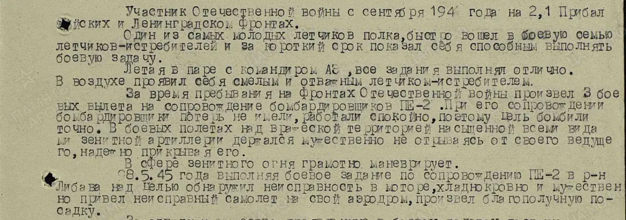 Накануне, 22-го февраля, «Мессершмитт Bf-109» (точная модификация не установлена — прим. В_О) прилетел к нам в училище, на наш аэродром, и с двух тысяч метров спикировал. Бросил крагу (лётная перчатка) на лётное поле, а в ней записка: «Сталин создал в Сталинграде Сталинскую кузницу авиационных кадров. Вызываю ваших лучших инструкторов и лётчиков завтра, 23-го числа, в 14 часов на 2000 метров на личный бой».